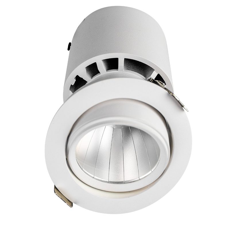 Luminario downlight dirigible de empotrar en techo, modelo AIT9530B, de uso interior. Potencia de 20 W, 100-277 Vca, 3000 K, ángulo de apertura de 24°, IRC >90, ON/OFF. Acabado en color blanco.