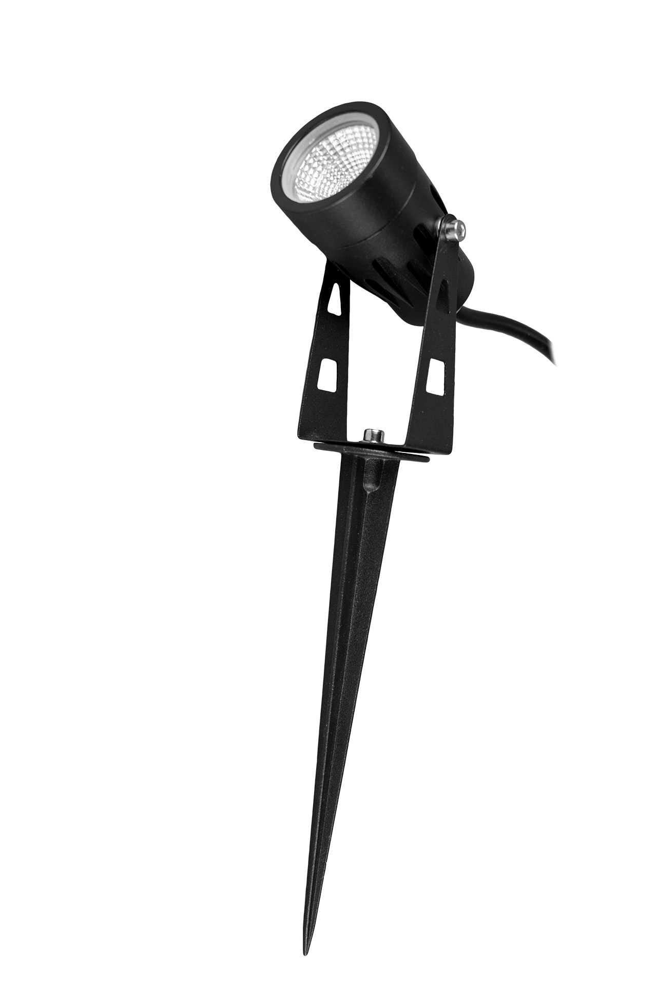 Luminario LED de jardín de sobreponer en piso o con estaca, modelo AES3027N, de uso exterior, 5W, 100-277 Vac, 2700K, ángulo de apertura de 60°, IRC >70. Acabado en color negro.